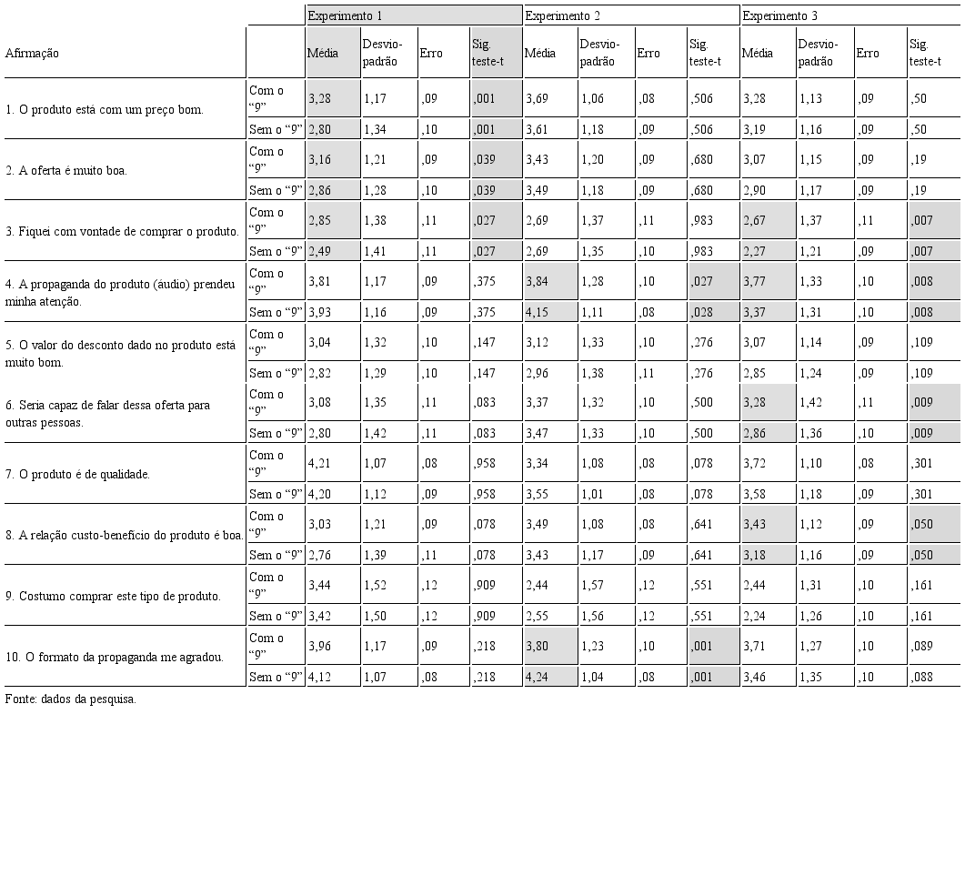 Ao analisar cada experimento separadamente, levando em consideração apenas as médias estatisticamente diferentes, os achados do experimento 1 sugerem que a utilização do dígito “9” no formato do preço na modalidade de áudio pode produzir impactos na percepção dos clientes quanto: à avaliação do preço (desempenho 17,38% superior), à avaliação da oferta (10,49% superior) e à intenção de compra (14,44%). Por outro lado, os resultados do experimento 2 revelaram que o mesmo formato de preço produziu efeitos negativos quanto à atenção dispensada ao anúncio (desempenho 7,87% inferior) e à avaliação do formato da propaganda (11,67% inferior). Entretanto, de acordo com os achados do experimento 3, a utilização do dígito “9” no formato do preço afetou a percepção dos clientes de maneira positiva não somente em relação à atenção dispensada ao anúncio (desempenho 11,88% superior), mas também à intenção de compra (17,51%), à indicação da loja (14,54%) e à avaliação da relação custo-beneficio do produto (8,02%).