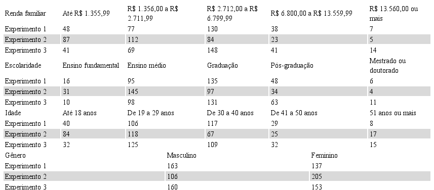 Percebeu-se forte similaridade entre as amostras dos experimentos 1 e 3 (Tabela 3), o que propiciou maior robustez às análises, baseadas no teste de comparação de médias. Por outro lado, as dissimilitudes mais evidentes percebidas no experimento 2 referem-se aos agrupamentos por renda, gênero e escolaridade. Em particular, a maior discrepância percebida diz respeito ao agrupamento por gênero, pertencendo 205 respondentes ao feminino contra apenas 106 do masculino, diferentemente dos outros experimentos, caracterizados por pequena maioria de respondentes do gênero masculino.