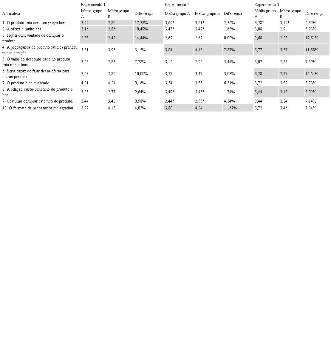 No que se refere ao experimento 1, foram detectadas três variáveis estatisticamente diferentes: 1 (O produto está com um preço bom 1); 2 (A oferta é muito boa) e 3 (Fiquei com vontade de comprar o produto). Com relação ao experimento 2, por sua vez, foram detectadas duas variáveis estatisticamente diferentes: 4 (A propaganda do produto (áudio) prendeu minha atenção) e 10 (O formato da propaganda me agradou). Finalmente, quanto ao experimento 3, foram detectadas quatro variáveis com médias estatisticamente diferentes: 3 (Fiquei com vontade de comprar o produto); 4 (A propaganda do produto (áudio) prendeu minha atenção); 6 (Seria capaz de falar dessa oferta para outras pessoas) e 8 (A relação custo-benefício do produto é boa).