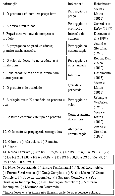 Todos os anúncios tiveram estruturas similares: uma mensagem inicial: “Você não pode perder as incríveis ofertas do… [nome da loja], confira:… [nome do produto e preço]”, seguida da repetição do nome do produto e do preço). Após ouvir o áudio, os entrevistados responderam a um questionário, utilizado como instrumento de coleta de informações (LAKATOS; MARCONI, 2003) e constituído por uma série ordenada de 10 afirmações, acompanhadas de uma escala de Likert de cinco pontos (Discordo totalmente = 1; Concordo totalmente = 5). Cada afirmação representava uma variável: percepção de preço, percepção de promoção, intenção de compra, percepção da comunicação, percepção de oportunidade, interesse, qualidade percebida, percepção de valor, comportamento de compra, atenção à comunicação. Tais variáveis foram avaliadas com o intuito de observar as diferenças de percepção dos respondentes quanto a cada aspecto da oferta. Assim, por meio da escala, os entrevistados expressaram suas opiniões de concordância ou discordância relacionadas à afirmação apresentada. Cada resposta recebeu uma classificação numérica, refletindo o grau de atitude dos respondentes (COOPER; SCHINDLER, 2003). O questionário utilizado pode ser visualizado na íntegra no apêndice B.