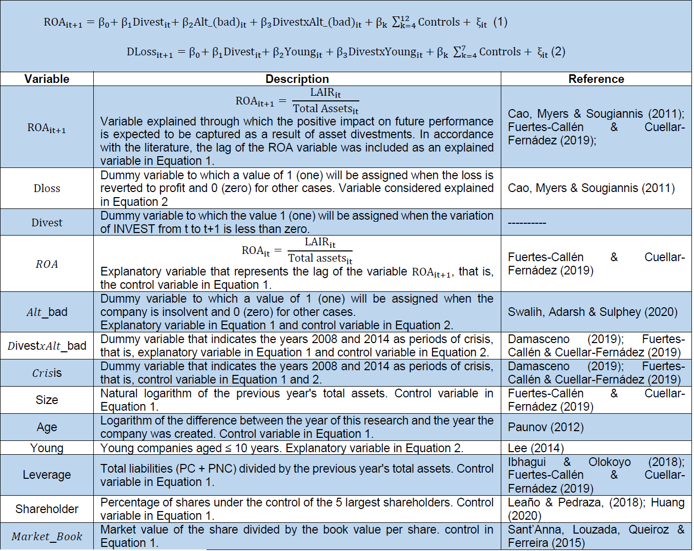 was expected to be positive, indicating that asset divestments carried out by companies in general increase the probability of reversing past losses into future profits in order to confirm hypothesis 2 and 3 to be positive, signaling that sales of assets held by young companies increase the probability of reversing past losses into future profits. Figure 1 shows Equations 1 and 2 and information on the variables that make up each model: