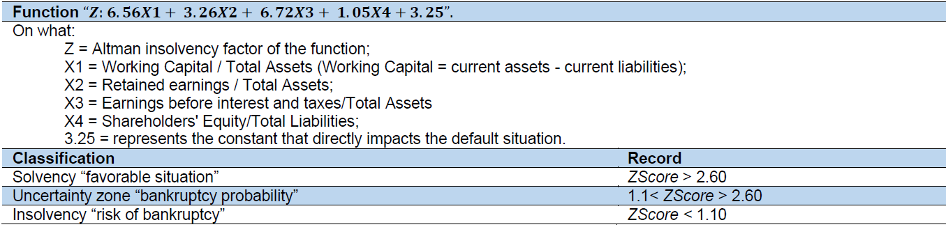 In order to control the effect of financial output on the relationship studied, the dummy variable Alt_Bad was included. Thus, for companies that indicated the possibility of bankruptcy, the Altman Z-Score methodology for emerging markets (Swalih et al., 2020) was applied, identifying them through the dummy variable Alt_Bad. This methodology separates companies into three categories: solvent (favorable situation); situation of uncertainty (probability of bankruptcy); and insolvent (risk of bankruptcy) as detailed in Table 4.