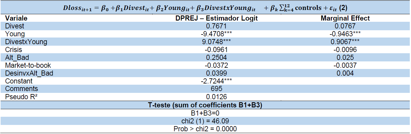 The increase in the probability of reversing past losses into future profits, given the divestments of assets carried out by companies in general, proved to be non-significant (Table 9). This result suggests that hypothesis 2 was not rejected. Perhaps this result may be an indication that the assets divested by companies in general are those that really do perform poorly over time (Kolev, 2016) and that their small potential for return may have influenced the performance of the divestment campaign to point of not contributing to reversals of past losses.