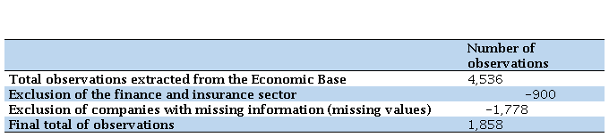 The construction of the database went through some steps that are described in Table 1, the initial sample contained 4,536 observations. Observations of financial companies, missing values, and negative equity were excluded from the sample. Thus, the final sample totaled 1,858 observations.