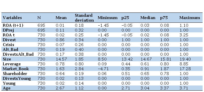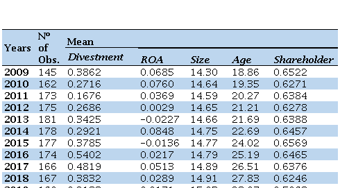 Table 2 contains information on the main variables by year. The average of the Divestment dummy variable presents the percentage of companies per year that presented divestment where we see that the year with the highest percentage of divestment was 2016, where 54.02% carried out asset divestments. The average profitability of companies per year, measured by ROA, varies from -2.27% (in 2013) to 7.6% (in 2010). The average size (logarithm of total assets) of companies has increased over the years, from 14.3 (in 2009) to 15.03 (in 2019). The average age of the companies in this sample ranges from 18.86 years (in 2009) to 28.97 years (in 2019). The average, per year, of the percentage of companies controlled by the majority shareholders is always close to 60%.