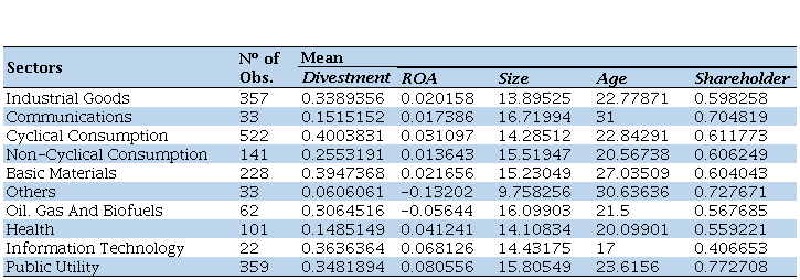 Table 3 contains information on the main variables by sector, for which the classification of companies by sector made by B3 was used. The sector with the least representation is the Information Technology sector, with 22 observations; and the most representative sector is the Cyclic Consumption sector. The largest number of companies/year that divested their assets was 40.04% of companies in the Cyclic Consumption sector, and the smallest amount was 6.06% of companies classified in Others. In terms of profitability, the sector with the highest average profitability was Public Utilities, with an average ROA of 8.05%. The largest sector, on average, was the Communications sector. The average age of companies by sector varies between 20.09 years (Health) and 30.63 years (Others). The Public Utilities sector has the highest average percentage of control of the largest shareholders, the majority shareholders hold 77.27% of the companies, on average. In the Information Technology sector, the majority shareholders hold 40.66% of companies, on average.