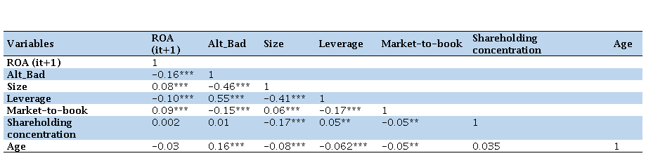 and the explanatory variable Alt_Bad, and this means that companies with financial difficulties tend to have lower future performance, but the results of the Pearson correlation analysis is a limited analysis, as it only looks at the correlation in a univariate way and without considering controls (Table 6).