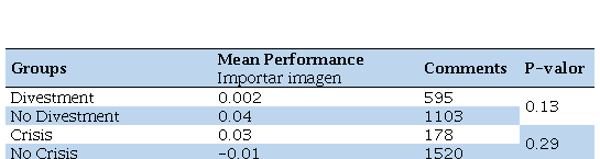 is the same when comparing companies that have divested and companies that have not. Likewise, the future performance of companies is not statistically different when comparing the crisis period with the other periods.