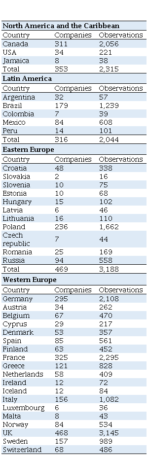 The sample was composed by companies negotiating shares in stock market from two continents (America and Europe) to achieve the goal of the present study. The preference was for selecting companies from four geopolitical regions (Latin America, North America, Western Europe, and Europe), due to historical-cultural, questions, law aspects, and economic development level. Such segmentation was performed because countries from the same geopolitical region have more comparable historical-cultural aspects and economic development level than those from different regions. It implies directly on the level of result management adopted by managers aiming at satisfying personal goals, since less developed countries command and control organs have lower enforcement skills and, in turn, investor protection (Modigliani & Perotti, 2000; Kouki, 2018).