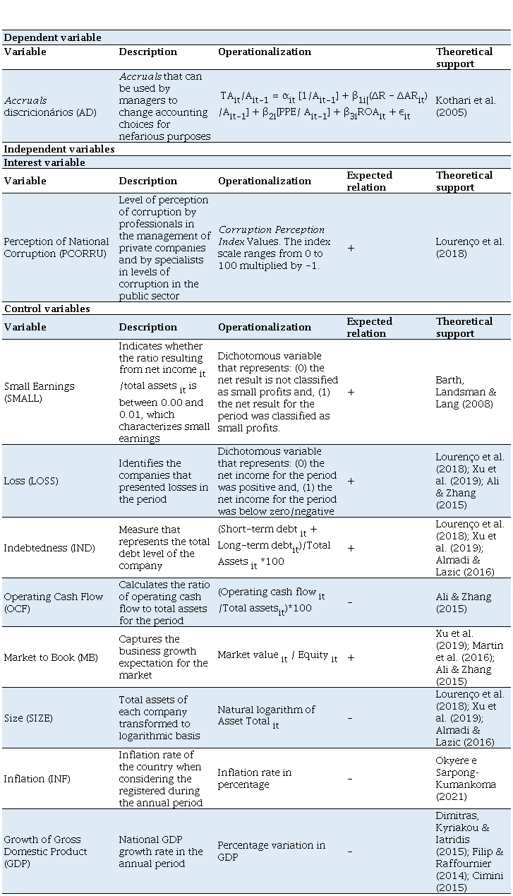 The dependent variable of the study encloses discretionary accruals (AD) which reflect the level of results management practiced by managers. The variable corruption perception (PCORR) is the independent variable of interest of the study. Besides, variables of control were used that, according to the literature, relate to discretionary accruals. The specifications of all those variables, as well as variables of control, including theoretical support, are presented in Table 2: