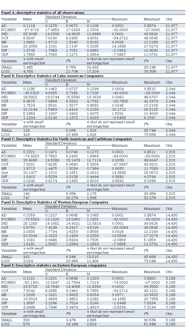 Those authors analyzed the matter without differentiating countries according to geopolitical regions. Since countries from the same region share law, economic, and corruption perception similar context, it was needed to make an individual analysis of each region. Segmented data analysis revealed that such relation occurs depending on the region the company negotiates shares at, since it is sustained by companies from Latin America, North America, and Caribe countries. On the other hand, corruption perceived by society is not a factor stimulating managers to manipulate results in companies from both Eastern and Western Europe.