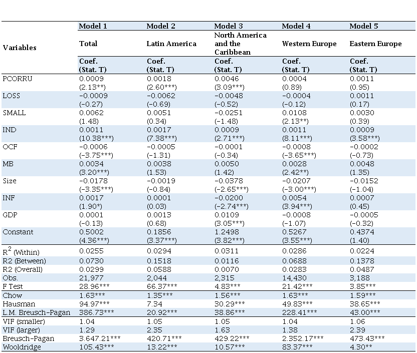 Evidence from Model 1 indicate that corruption perception relates in a positive and significant way (Coef. = 0.0009; p-Value<0.033) to discretionary accruals. It shows populations’ perception stimulates managers to adopt or intensify practices of result management. Other regression multivariate models indicate that companies from Latin America countries (Coef. = 0.0018; p-Value < 0.009) and North America and Caribe ones (Coef. = 0,0046; valor-p < 0,002) there is a positive, significant relation between corruption perception and discretionary accruals. Results from other models (both Western and Eastern Europe) suggest there is no statistically significant relation between corruption perception and discretionary accruals.