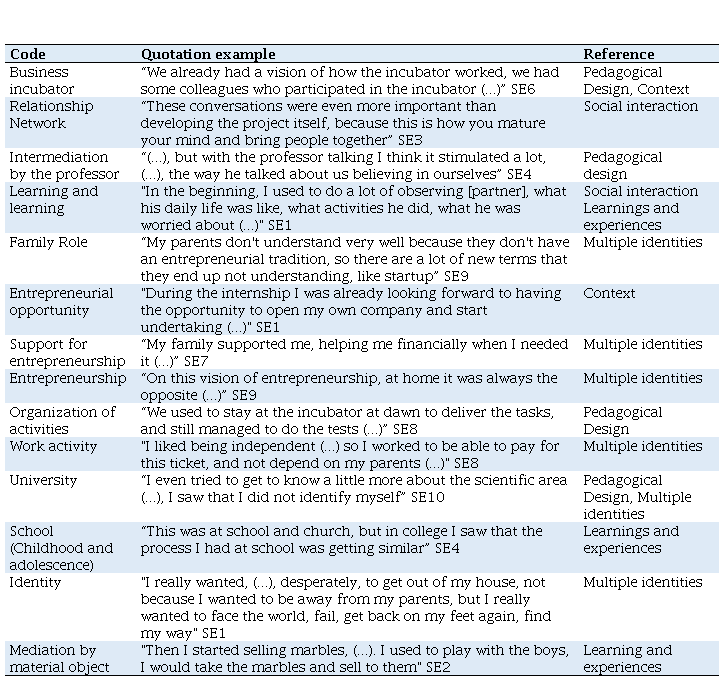 These meetings were recorded in audio and video and the transcripts were systematized using the Atlas.ti software. In general, 606 excerpts from the set of narratives and 22 codes were produced, 14 of which were directly related to the cut of this work. The set of narratives and records made up the corpus of analysis and interpretation of the research based on narratology (Alves & Blikstein, 2006). For this, the documents were exported to Microsoft Excel and the analyzes were inserted into a new column relating the empirical findings and the theoretical-empirical framework of the study. It was observed that the citations extracted from the analysis codes addressed social interaction, pedagogical design, the challenges faced related to multiple identities, learning and the institutional context. In this sense, Table 1 demonstrates, through citation examples, the references that emerged as main aspects of social entrepreneurial learning at the university. Participants were named with the initials SE (Student-Entrepreneur) plus a number to distinguish them.