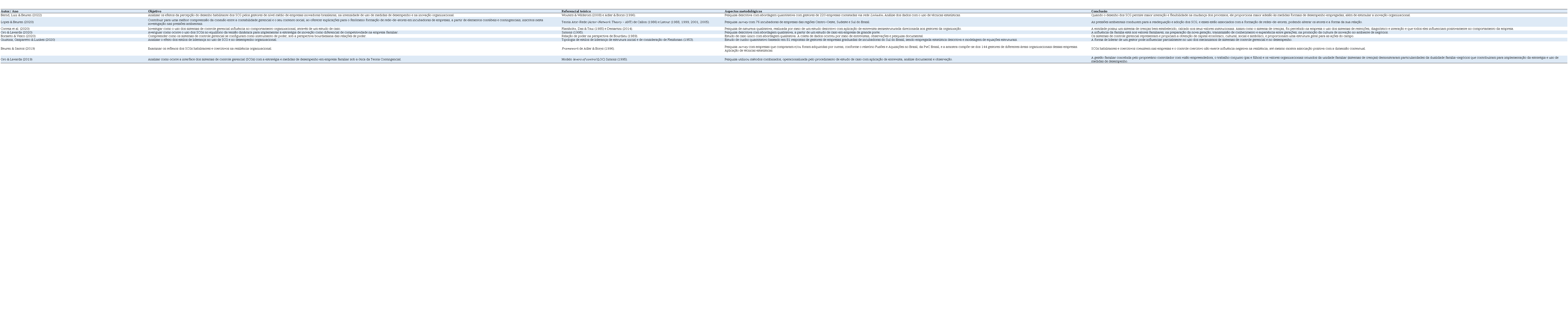 Considerando a relevância dessa temática, diversos estudiosos têm desenvolvido seus estudos em âmbitos diferentes do desta pesquisa. Os estudos anteriores citados foram selecionados por meio de uma busca do termo “sistemas de controle gerencial” na plataforma Scientific Periodicals Electronic – SPELL, onde foram encontradas 41 publicações e, para essa análise, foram considerados os últimos cinco anos, de 2018 a 2022, com os periódicos que continham a partir de duas publicações. A Tabela 1 apresenta os principais estudos que orientam o presente trabalho.