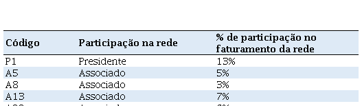O critério para escolha das lojas associadas à rede de supermercados participantes deste estudo foi incluir as empresas com maior faturamento, visto que representam 34% do faturamento total da rede. A Tabela 2 apresenta a participação dos associados no faturamento total da rede em 2021, representados pela letra A e a numeração das lojas; a letra P está relacionada ao presidente, responsável pela gestão de toda rede.