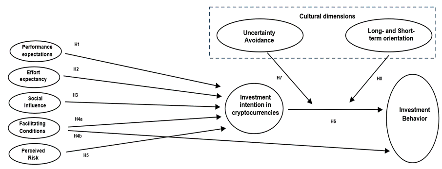 After compiling the initial considerations, the proposed model is composed of the UTAUT theory, as it carries the constructs that best capture the intention to invest in cryptocurrencies, appropriately capturing social aspects and external facilitators, as well as technological factors of cryptocurrencies (Jung et al., 2018). Hypotheses H1 to H4 and H6 emerged from the UTAUT. A construct that has proved important in cryptoasset investment research was added to the model: perceived risk, as shown in hypothesis H5. In the cultural hypotheses taken from Hofstede's (2003) understanding of a country's culture, to analyze an individual's cultural moderation between the intention and behavior to invest, follow the hypotheses H7 and H8.