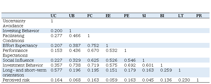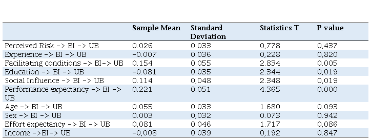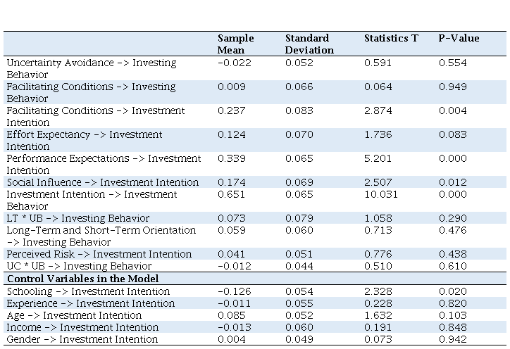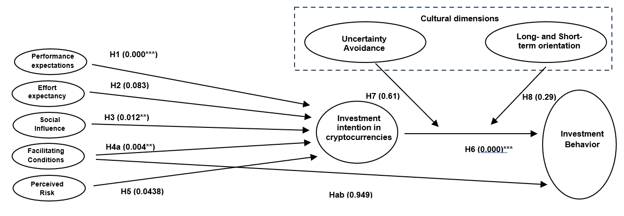 The analysis of hypotheses and construct relationships was based on the examination of standardized paths. Path coefficient levels were estimated using the bootstrapping method (Henseler et al., 2009), with 5000 resampling interactions (Chin, 1998). The p-value results are summarized in Tables 5 and 6. The factors that positively influence investment intention and indirectly investment behavior are effort expectancy, performance expectancy and social influence. It has no effect on the intention to invest in cryptoassets and indirectly on the final behavior, the perceived risk and the expectation of effort. The facilitating conditions construct has no direct effect on behavior. Cultural constructs had neither a direct nor a mediating effect on behavior.