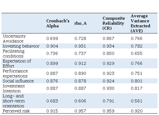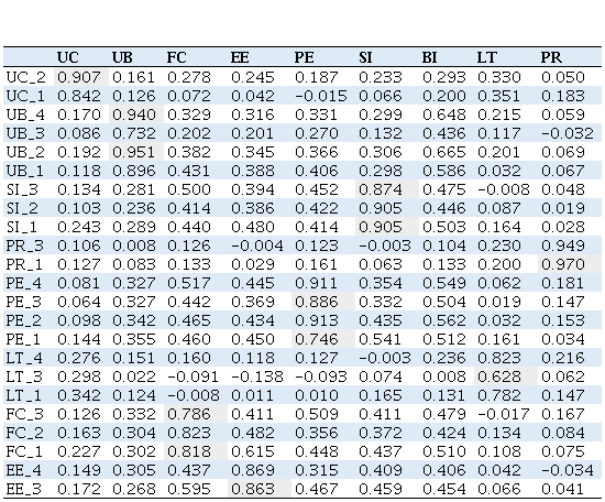 Once the data had been collected, they were analyzed, starting with the validation of the measurement model, which is the first step in evaluating the results in PLS-SEM (Hair et al., 2019). All the constructs in this model are reflective. In order to check internal consistency and convergent and discriminant validity, a confirmatory factor analysis (CFA) was carried out to verify the factor loadings of the construct indicator items, with values greater than 0.708 being accepted as valid (Hair et al., 2019). The indicator for the long- and short-term orientation construct, LT2, had a factor load of 0.49 and was removed from the model. The same goes for the indicators of facilitating conditions, FC4 factor load 0.68, perceived risk, PR2 factor load 0.56 and uncertainty avoidance, UC3 factor load 0.54, improving the consistency of the model. The other constructs did not present any problems for further analysis.