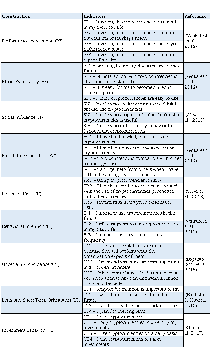 To provide evidence of these relationships, this study used determinants of investment in cryptocurrencies, used in the international literature on the subject (Kwateng et al., 2019), Jung et al, 2018; Williams, et al., 2015), components of the Unified Theory of Acceptance and Use of Technology (UTAUT) (Venkatesh et al., 2003),, components of the Unified Theory of Acceptance and Use of Technology (UTAUT) (Venkatesh et al., 2003), considering the technological and innovative nature of this asset. As seen in the literature, it is important to add the variable of perceived risk in the model tested, since the essential treatment is in the applicability of cryptocurrencies as an investment (Nseke, 2018; Oliva et al., 2019).