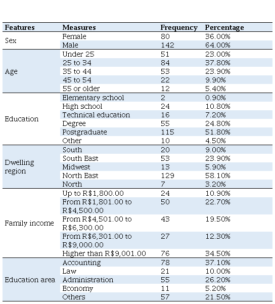 The survey was carried out and the data was collected from February 2021 to May 2021, totaling 380 responses, excluding those in which the respondent declared not knowing what cryptocurrencies are or not intending to invest in them, leaving 222 valid responses for analysis. The sample had the following demographic and socioeconomic characteristics, which can be seen in Table 1.