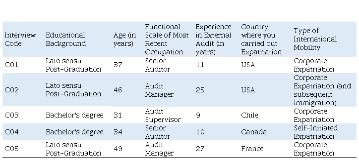 As for the data collection technique, five narrative interviews were carried out (Bauer & Gaskell, 2013), whose brief guiding questions made it possible to identify the participants' profile (see Table 1), learn about their professional careers in general, the difficulties and impressions of a career in external auditing and the internationalization strategies they developed until they reached or surpassed the position of senior auditor. Additionally, in compliance with ethical regulations involving research with human beings, it should be noted that a pattern of codes was created to identify each interview (C01, C02... C05) and thus preserve the identity of the participants.