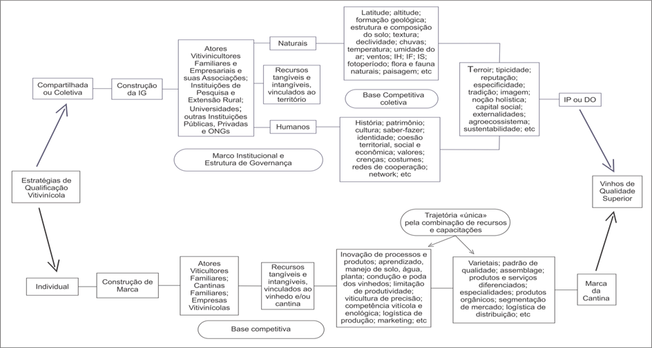 Para que isto seja possível, propõe-se um modelo que trabalha com duas estratégias de forma simultânea e não excludente: a primeira, através da construção e consolidação da IG, que chamamos de “estratégia compartilhada ou coletiva”, e a segunda, as “estratégias individuais”, desenvolvidas pelos vitivinicultores nas suas empresas, percorrendo uma trajetória resultante da combinação “única” dos seus recursos e capacitações. A primeira, uma estratégia “potencial” resultante de um conjunto de fatores territoriais naturais, geográficos e humanos os quais, só serão expressos na sua plenitude se acompanhados da segunda, ou seja, do desenvolvimento permanente dos recursos e capacitações dos agentes que, pela sua “combinação única”, aplicada aos vinhedos e cantinas e associados àquelas, permitirão obter produtos e serviços típicos de qualidade superior. Quer dizer, o fato do vinho proceder de uma região altamente favorável ou vocacionada à vitivinicultura, pela presença de um conjunto de atributos consubstanciados na IG, não garante, por si só, a materialização de todos estes atributos no produto vinho, caso os vitivinicultores não desenvolvam capacitações específicas e um aprendizado permanente que lhes permita a obtenção de uvas e vinhos com a distinção e tipicidade “anunciadas” pela IG.