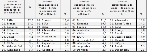 Isoladamente a Europa ainda é, de longe, o maior produtor, consumidor, exportador e importador de vinho do mundo (Quadro 1). Entretanto, na atualidade, as exportações do novo mundo do vinho crescem em maior velocidade. Este cenário sugere uma transformação radical neste mercado que ocorre, não apenas pelo reposicionamento dos atores líderes, mas, também, pelo surgimento de novas convenções de qualidade.