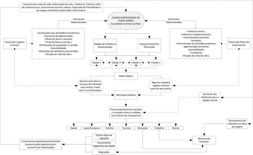 O esquema exposto na Figura 1 traz a ideia de uma aglomeração urbana em que uma cidade de porte médio tem o papel de dinamizar toda a região. Dessa forma, observou-se que alguns elementos da Teoria dos Lugares Centrais e da Teoria dos Polos de Crescimento são materializados nessa cidade de porte médio que, por sua vez, acaba sendo considerada como uma localidade central ou a cidade polo da região. Esses elementos dinamizadores criam no polo a ideia de dependência, de concentração e da existência de um grupo de outras cidades que gravitam ao redor do centro, em seu campo de influência econômica e política (BOUDEVILLE, 1972; FRIEDMAN, 1972). Essa dependência, em grande parte, é gerada pela capacidade dos elementos dinamizadores positivos que o polo tem, criando uma força centrípeta em relação aos demais.