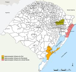 A escolha da área de pesquisa recai sobre a Aglomeração Urbana do Nordeste – AUNe, que está localizada na região Nordeste do Estado do Rio Grande do Sul, por se tratar de uma região altamente urbanizada e industrializada onde se tem observado, nas últimas duas décadas, um aumento da conurbação e da interdependência entre as áreas urbanas. Além disso, destacam-se outros fatores: o primeiro é que foram consideradas apenas as aglomerações urbanas[10] (Figura 2) instituídas legalmente via Leis Complementares no Estado do Rio Grande do Sul, porém foi excluída a Aglomeração Urbana do Litoral por ser a única que não possui uma cidade de porte médio que faça o papel de dinamizar a região; o segundo foi a escolha da maior aglomeração urbana do Estado em termos populacionais; o terceiro é que esta Aglomeração está localizada em uma das regiões que mais tem recebido migrantes no Estado; o quarto é que, em comparação com a Aglomeração Sul, a Aglomeração Nordeste concentra o maior número absoluto de trabalhadores nas indústrias e o maior número de estabelecimentos industriais, um fato que proporciona maior atração de trabalhadores de outras cidades devido à oferta de bens e serviços.