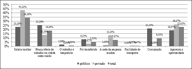 Alguns entrevistados (23,02%) disseram que foram trabalhar em outro município porque havia “aparecido a oportunidade” de um emprego melhor. A leitura desse motivo, de que apareceu a oportunidade, pode proporcionar diferentes interpretações, como, a de que apareceu a oportunidade de: um emprego; um melhor salário; uma melhor condição de trabalho; um melhor crescimento profissional; trabalhar numa determinada cidade; ficar mais perto da minha família, entre outros tantos fatores. Nesse sentido, tal motivo pode conter um fator específico ou um conjunto de fatores não-contemplados nas alternativas da pesquisa, mas que pode ser foco de futuras pesquisas.