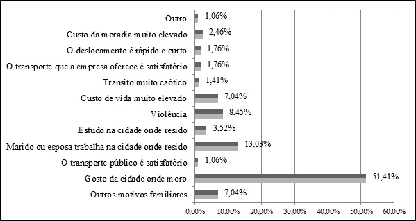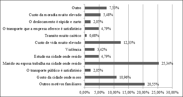 Já a questão familiar vem em segundo lugar, com quase 29% dos entrevistados (somatório do motivo “marido/esposa trabalha na cidade onde residimos” e “outros motivos familiares”), questão que na pesquisa realizada por Stamm (2005) foi considerada como principal motivo para os trabalhadores não migrarem. Numa análise comparativa entre as pesquisas observa-se uma inversão de posições entre os motivos (familiares e de gosto pela cidade em que os trabalhadores pendulares residiam) pelos quais os trabalhadores não migraram para o município em que estavam trabalhando. Por se tratar, em grande parte, de fluxos de cidades menores para outras maiores ou de porte médio, ainda se observa que existe certo apego e uma apreensão em morar em cidades de maior porte, mesmo que seja uma cidade de porte médio interiorana.