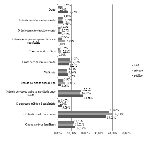 Num contexto geral, o Gráfico 5 traz a amostra total pesquisada e a divisão segundo o tipo de transporte, o que permite afirmar que a maioria dos entrevistados não queriam ou não tinham intenção de migrar para a cidade onde trabalhavam por gostarem da cidade onde residiam, sendo representados por 37,67% do total da amostra. Esse fato também foi verificado por Stamm (2005) quando analisou o fluxo de trabalhadores da cidade de Toledo (uma cidade de porte médio, com cerca de 125 mil habitantes) para a cidade de Cascavel (cidade de porte médio, com cerca de 290 mil habitantes), ambas localizadas no interior do Estado do Paraná. Segundo o autor, este motivo foi o segundo mais importante. Mesmo assim, afirma-se que o motivo ainda é muito marcante, tanto quando se analisam duas cidades interioranas distintas (por exemplo, Toledo e Cascavel) como quando se analisa uma aglomeração urbana interiorana (AUNe).