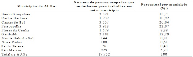 Vale destacar que os dados da coluna A são referentes ao Censo demográfico de 2010 e que, de acordo com o IBGE, as pessoas que trabalhavam em outro município atingiram 11,8% da população ocupada no país (10,1 milhões). Sendo assim, quatro municípios da AUNe apresentam percentuais de trabalhadores pendulares acima do verificado no país, sendo eles: Farroupilha (22,07%); Caxias do Sul (20,04%); Bento Gonçalves (18,71%) e Garibaldi (12,29%).