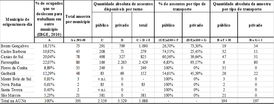 Já os valores das colunas H e I representam a quantidade absoluta da amostra por tipo de transporte que foi pesquisado em cada um dos municípios, representando um total de 391 trabalhadores pendulares na AUNe. Os números expostos na coluna H são referentes à multiplicação da coluna B com a coluna F. Por exemplo: no município de Bento Gonçalves foi preciso pesquisar 73 pessoas, porém 26,70% dos pesquisados utilizaram transporte coletivo público e os restantes 73,30% utilizaram transporte coletivo privado. Dessa forma, 73 x 26,70% é igual a 19 pessoas que utilizaram transporte coletivo público, e assim sucessivamente para cada município.