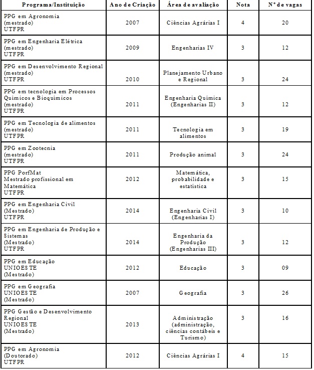 É importante considerar também que as áreas fundamentadas nas tecnologias e engenharias passaram a compor o cenário da Região Sudoeste do Paraná. Por mais que ela ainda tenha predominância agrícola, aos poucos tem-se transformado e introduzido a seu desenvolvimento o setor tecnológico e industrial. Assim, estão sendo ofertados os PPG em Tecnologia em Processos Químicos e Bioquímicos, Tecnologia de Alimentos, Engenharia Elétrica, Engenharia Civil e Engenharia de Produção e Sistemas.