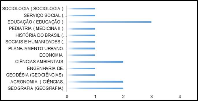 As áreas com maior número de representantes no período do estudo foram: educação com 16,7%; geografia e ciências ambientais e ciências agrárias I, com 11,1% cada (Gráfico 1). A diversidade de formação dos docentes demonstra a capacidade de produção de trabalhos multidisciplinares.