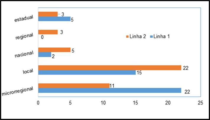Quanto a abrangência dos temas tratados nas dissertações, o Gráfico 2 mostra que mesmo tendo predominância na escala local, o somatório das demais (estadual, regional nacional e macrorregional) evidencia que o lastro da territorialização não desvia o foco das reflexões sobre a abrangência regional.