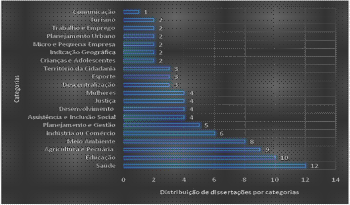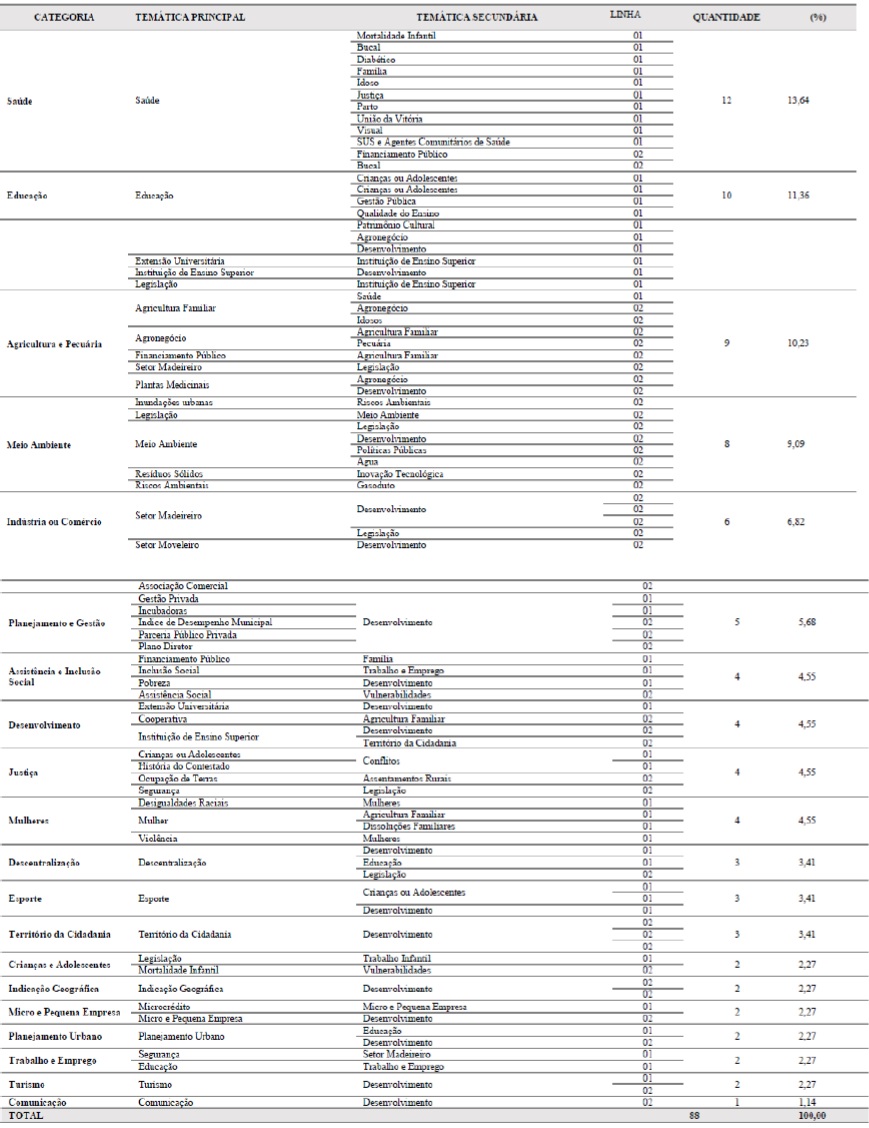 Das cinco áreas das políticas públicas, a identificação de 20 categorias distintas, indica a robustez do atributo de interdisciplinaridade no âmbito do PMDR. Nesse contexto, torna-se conveniente demonstrar os objetos de pesquisas das dissertações classificados em temáticas principais e temáticas secundárias, anteriormente já distribuídas em categorias. A Tabela 1 cumpre este propósito, evidenciando pormenorizadamente as temáticas principais e temáticas secundárias abordadas: