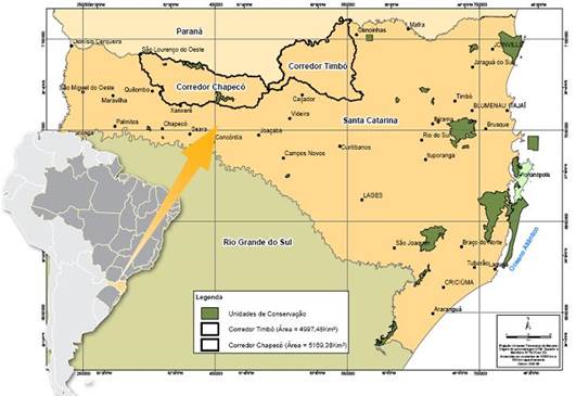 Em Santa Catarina, desde 2010, por meio de decretos, o Governo do Estado está implementando dois Corredores Ecológicos nas Bacias Hidrográficas dos rios Chapecó e Timbó, sendo que neste são abrangidos municípios do Planalto Norte Catarinense (Figura 1). A área dos dois corredores, que soma mais de 10 mil km² em 34 municípios, corresponde a 10,7% da área do território catarinense.