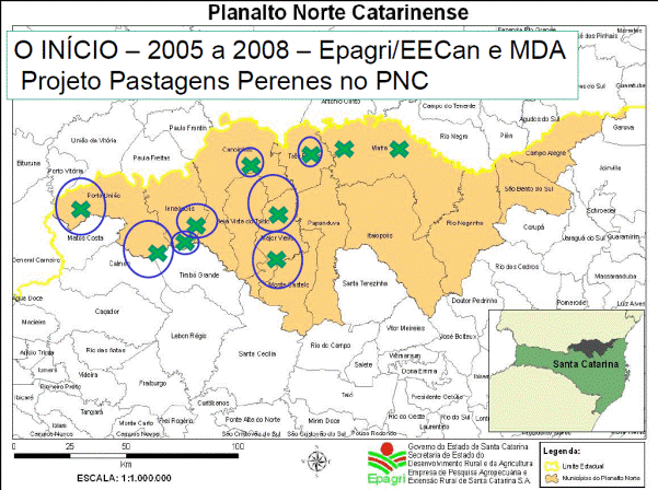 Em 2004 a Epagri – Estação Experimental de Canoinhas (EECan) iniciou um projeto em parceria com o Ministério do Desenvolvimento Agrário para validação de tecnologias adaptadas à agricultura familiar. O objetivo do projeto era implantar 10 unidades de validação no território em propriedades familiares e com o apoio da pesquisa dar início ao trabalho de avaliação da adaptação de algumas espécies de pastagens perenes às condições edafoclimáticas da região.