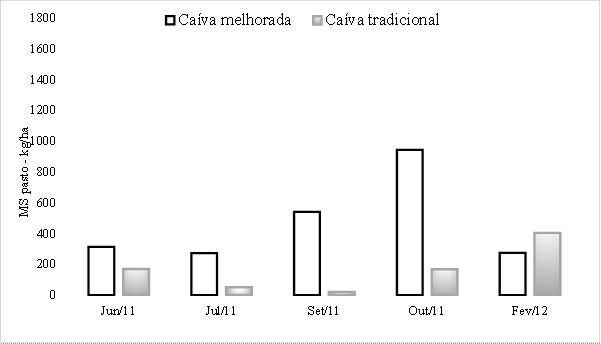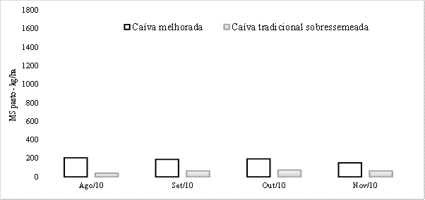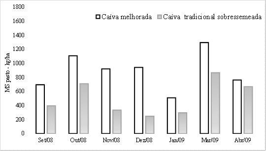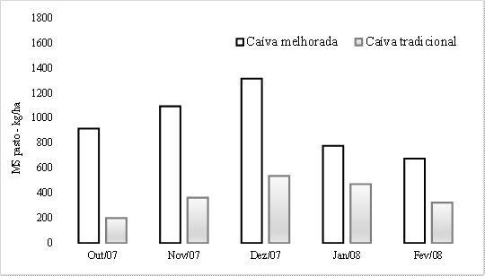 A produção total de pasto foi de 2.400 e 5.000 kg/ha de MS, respectivamente, para caíva tradicional (sem adubação) e caívas adubadas, independentemente da fonte. A caíva melhorada apresentou resultados próximos aos observados em campo nativo a pleno sol, com uso de esterco líquido de suíno (SCHEFFER-BASSO; SCHERER; ELLWANGER, 2008) o que permite inferir a validade do uso de insumos agroecológicos aplicados em cobertura para aumento na produção de pastagens nativas em áreas de caíva.
