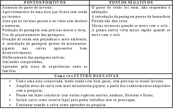 O resultado do Diagnóstico Rápido Participativo realizado com o Grupo Gestor das Caívas ao final da segunda fase da pesquisa confirmou a validade dos resultados obtidos nos experimentos (Quadro 1). Isso porque as famílias visualizavam os resultados diretamente na produção animal (leite), confirmando ou não a efetividade e aplicabilidade dos resultados.