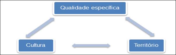 Um produto típico pode ter dois significados. O primeiro significado do termo refere-se à propriedade peculiar de ser de um grupo, país, região, etnia, etc. O segundo significado do termo normalmente faz referência ao produto com certas características típicas. Esse último significado leva-nos a considerar as características típicas como o efeito da interação entre o território em que esse processo se desenrola, a cultura da comunidade dentro do qual ele evolui e a qualidade específica do produto em questão (CHAMPREDONDE, 2011). Na Figura 1, procuramos representar essa relação.