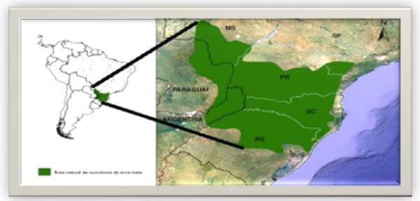 O agronegócio da erva-mate é expressivo no sul do Brasil, com aproximadamente 663 mil pessoas envolvidas com essa atividade, e em torno de 110 mil propriedades agrícolas que se dedicam à sua produção (KREUZ; SOUZA; STADLER, 2005). A área de distribuição natural da erva-mate, abrange, aproximadamente, 540.000 km², cerca de 3% do território da América do Sul, compreendendo áreas do Brasil, Argentina e Paraguai, situadas entre as latitudes de 21ºS a 30ºS e longitudes de 48° a 56°W (Figura 2) (ROSSA, 2013).