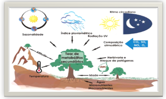 As condições ambientais são fatores que afetam a biossíntese na interface química entre as plantas e o ambiente circulante, as quantidades de compostos bioativos podem variar por inúmeros fatores (Figura 3), como, a sazonalidade, temperatura, disponibilidade hídrica e de nutrientes, radiação ultravioleta, ritmo circadiano, poluição, entre outros (SILVA, 2012).