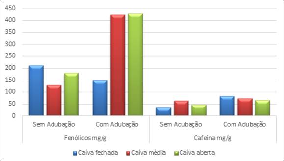 Relativo às diferenças observadas nas plantas que receberam a adubação orgânica, como a cafeína é formada por moléculas de nitrogênio (RATES, 2004), o maior teor observado nas plantas adubadas, provavelmente está relacionado ao nitrogênio que havia na composição do adubo usado. Essa observação de melhoria nos teores de cafeína pode possibilitar a obtenção de matéria-prima com maior ou menor teor de cafeína, por meio do manejo de adubação (Gráfico 1). No entanto, não se pode deixar de registrar que o fatorgenética da planta tem grande influência como sugerem Donaduzzi et al. (2003), sobre as características das plantas e pode ser responsável por grande parte dos resultados obtidos.