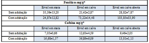 A Tabela 1 ilustra, a média e desvio padrão do teor de fenólicos e metilxantinas das plantas avaliadas na propriedade rural, divididas em erval na mata (sombreada), erval em caíva (luminosidade intermediária) e erval em caíva aberta (maior incidência de luz), sendo todos ervais nativos.