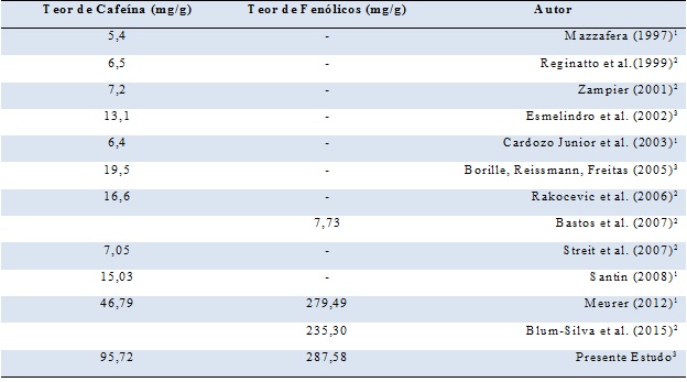Para a erva-mate é comum haverem variações importantes nos teores de cafeína e compostos fenólicos, conforme indicações constantes na Tabela 2.