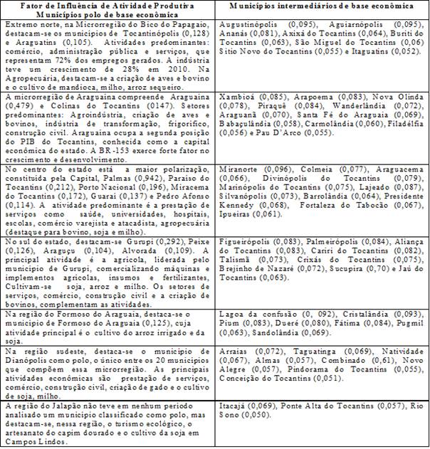 Tendo como base as áreas de influência das atividades produtivas, Quadro 4, estabelece-se a hierarquia das aglomerações no espaço regional do Tocantins. No entanto, os efeitos de retardamento (backwash effects) previstos por Myrdal (1968) ocorrem na maior parte do estado. O desenvolvimento regional não ocorre em toda parte ao mesmo tempo e de forma homogênea, manifestando-se com intensidade diferente, por exemplo, nas cidades que estão no entorno da BR-153, principalmente aquelas cidades que têm centralidades de diversas atividades aglomerativas, pessoas e negócios na base de polo diversificado.