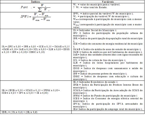 Após a escolha, o levantamento e a ordenação dos dados, foi feita a estimativa do Índice de Desenvolvimento Regional (IDR), que serve para classificar o perfil econômico e social de cada município em relação ao estado, nas seguintes etapas: